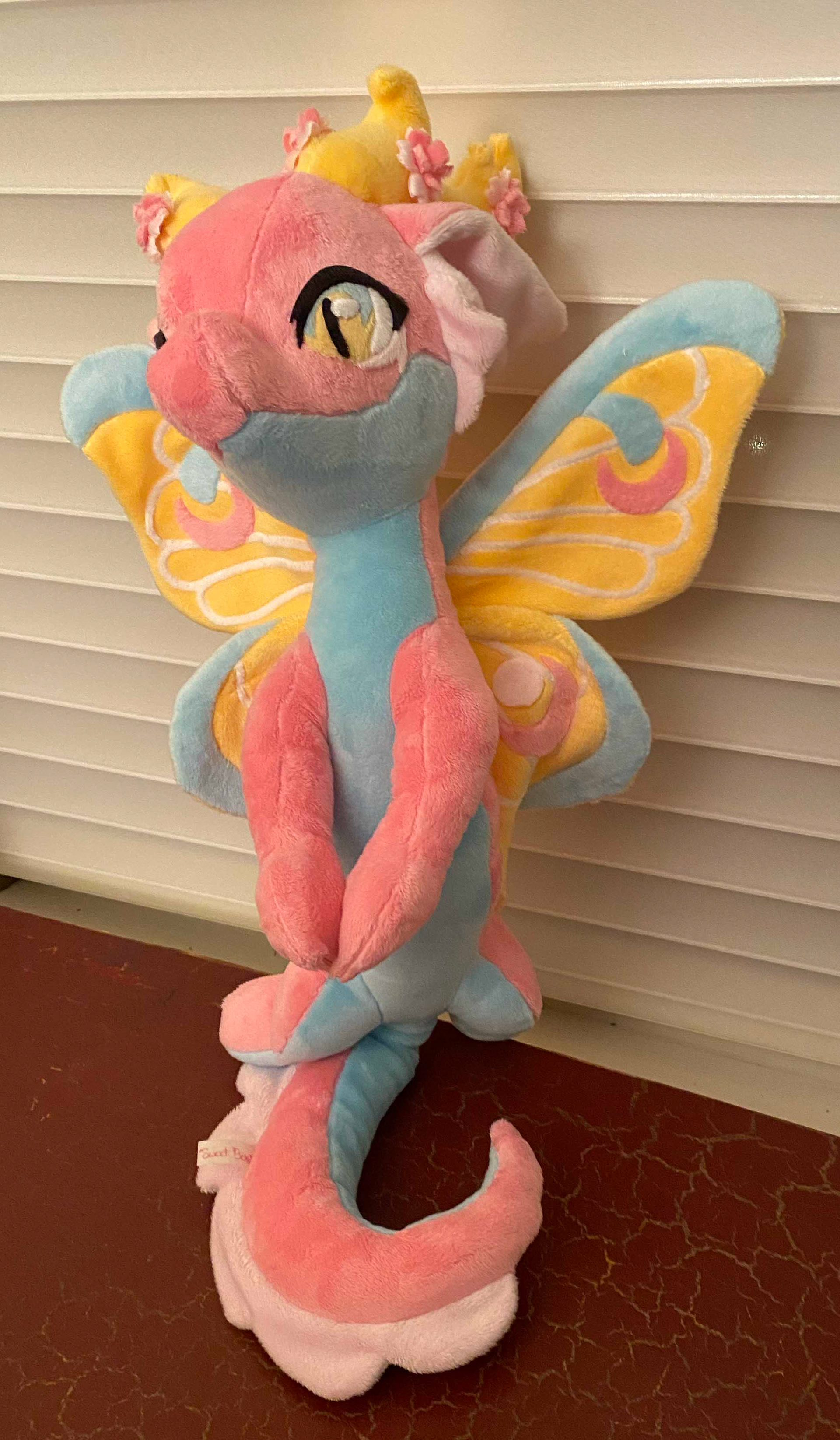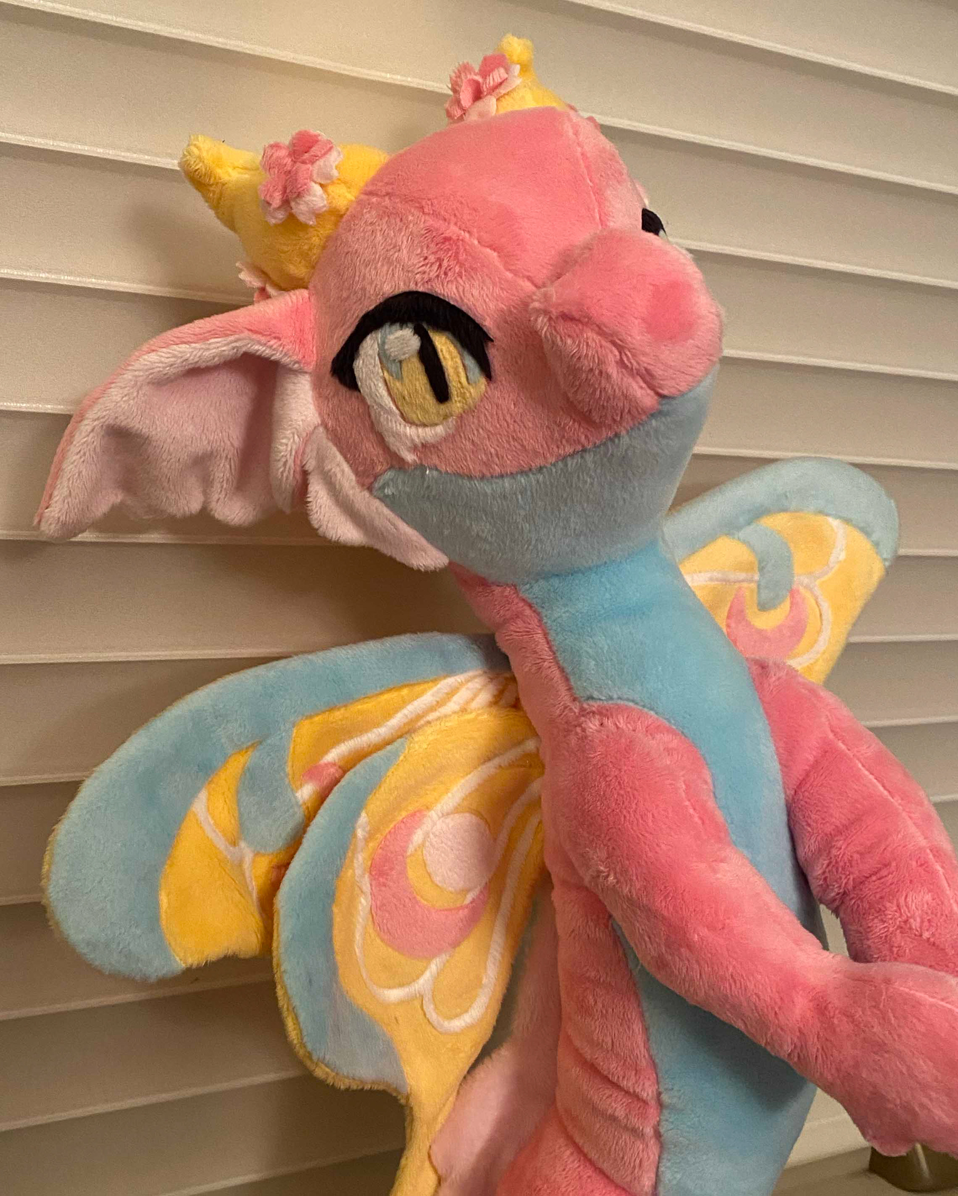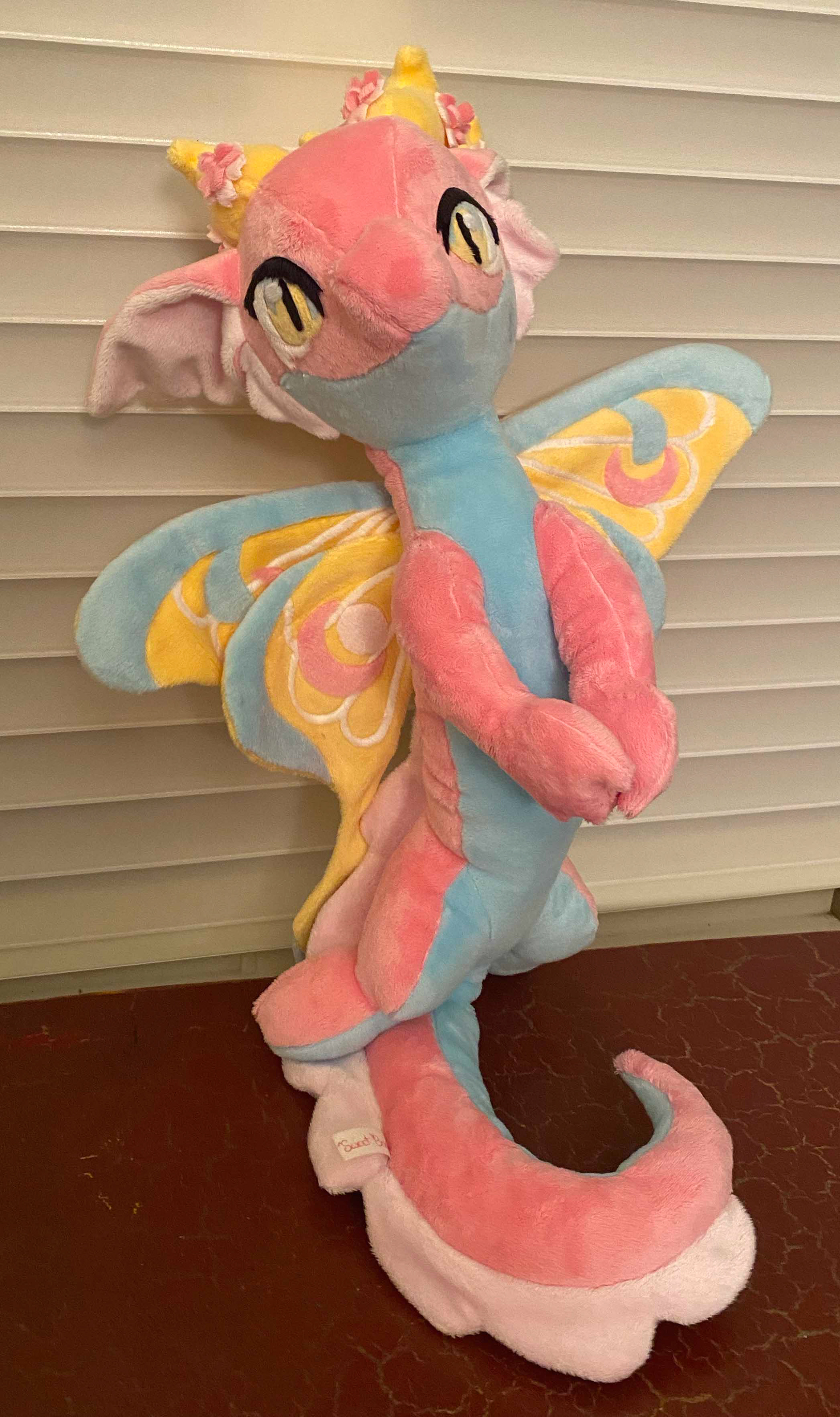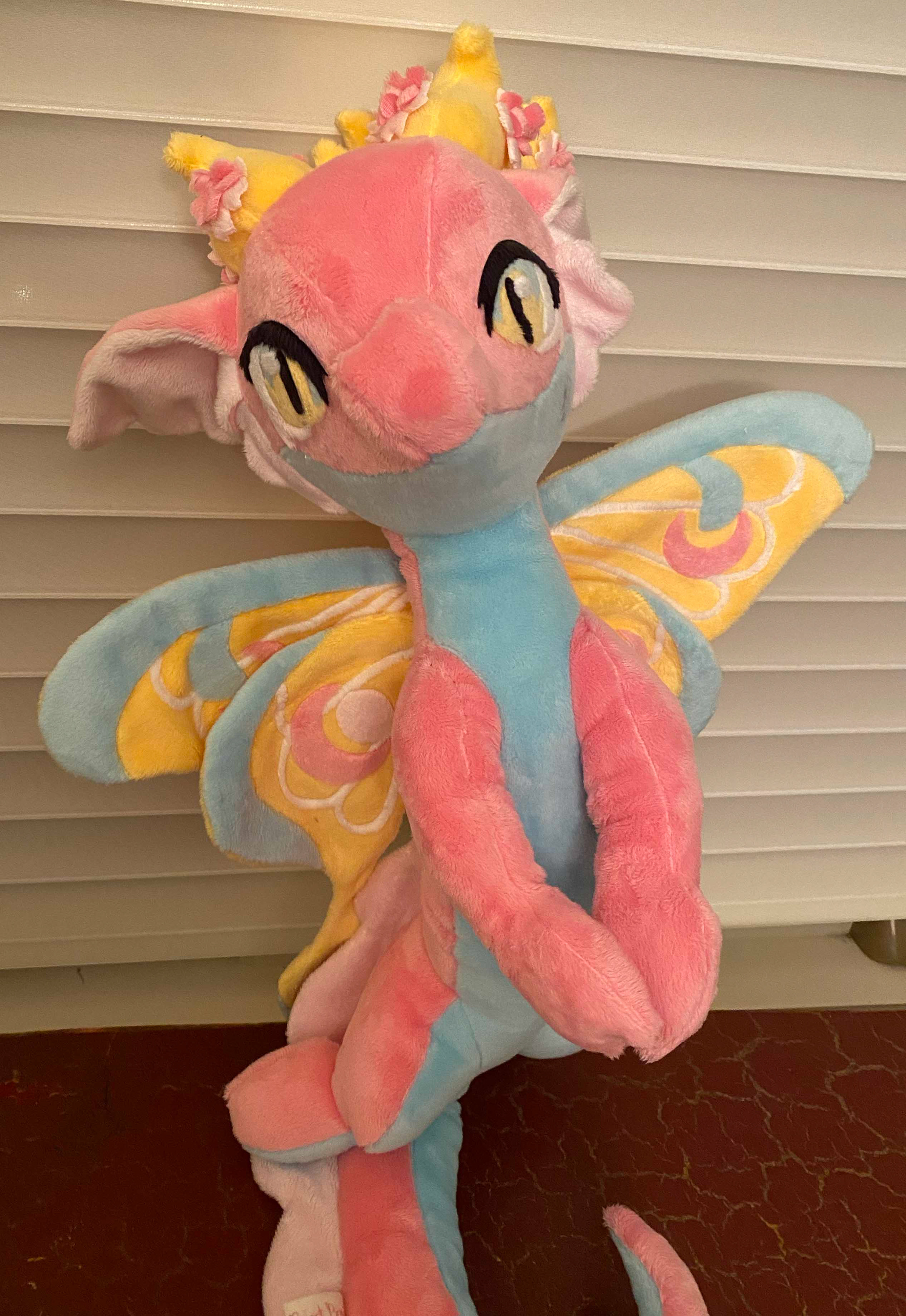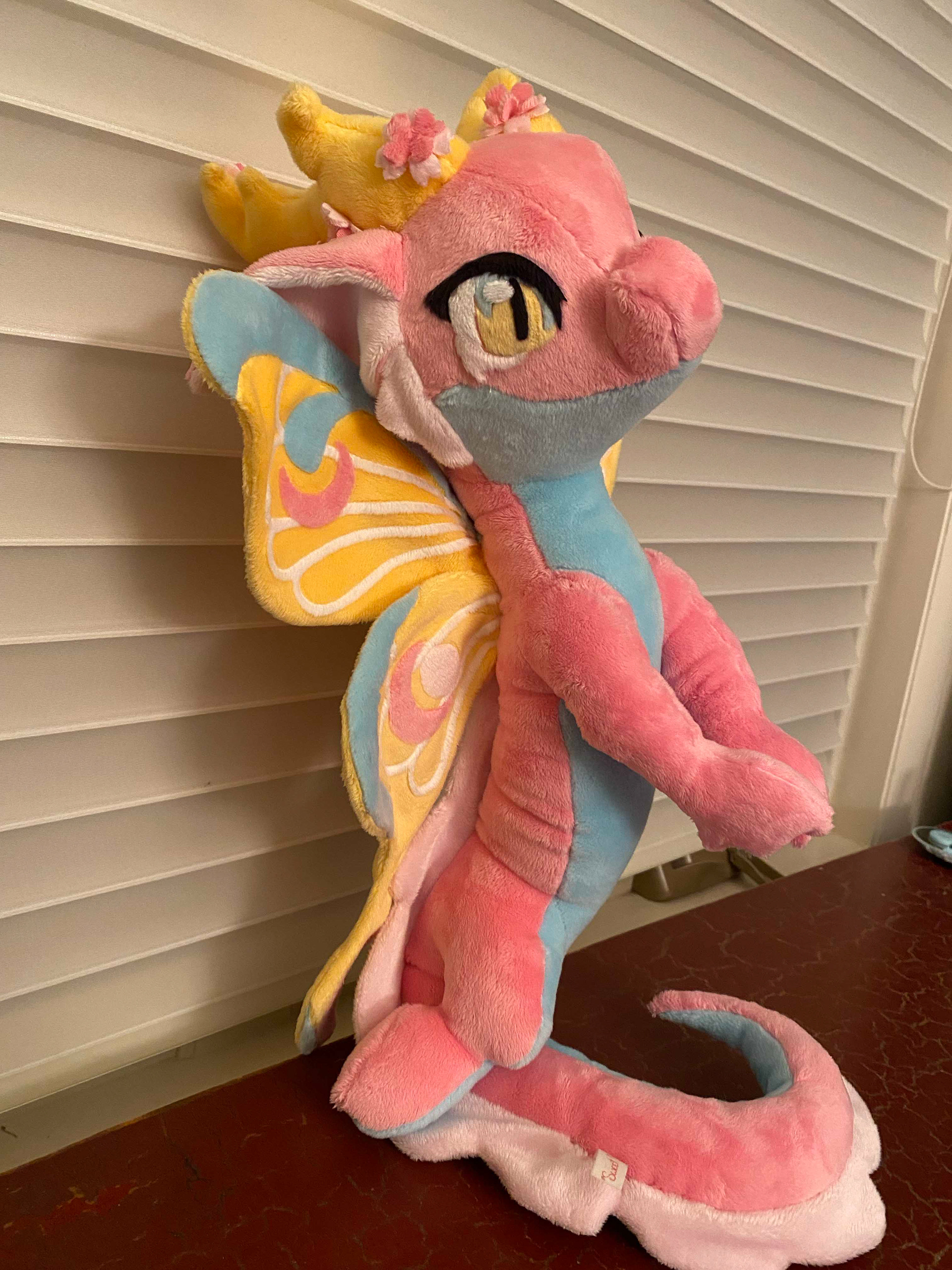 This vibrant dragon is ready to fill your day with sunshine and flower! Her soft tail and gorgeous wings have armature wire so she can be supported upright, and the wings can be outstretched for her to fly, or folded in to rest. Let this beautiful dragon flutter it's way into your life!