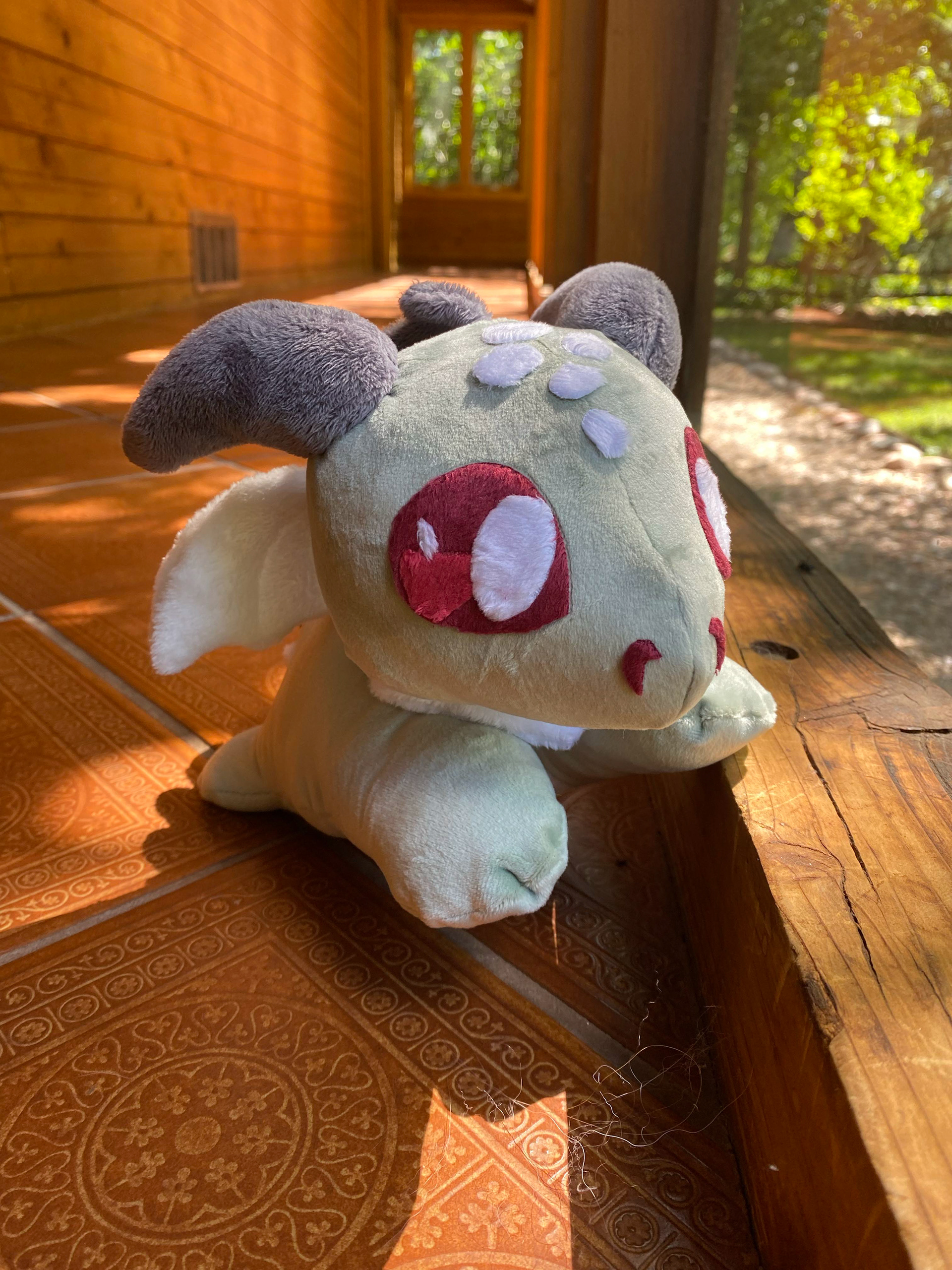 Meet this French Dragon commissioned for a grand baby, Remy! This little chubby dragon has ruby red eyes derived from French folklore and sports the new baby's name on its side. It is made from a stretchy plush fabric that is impossible not to hug and snuggle!