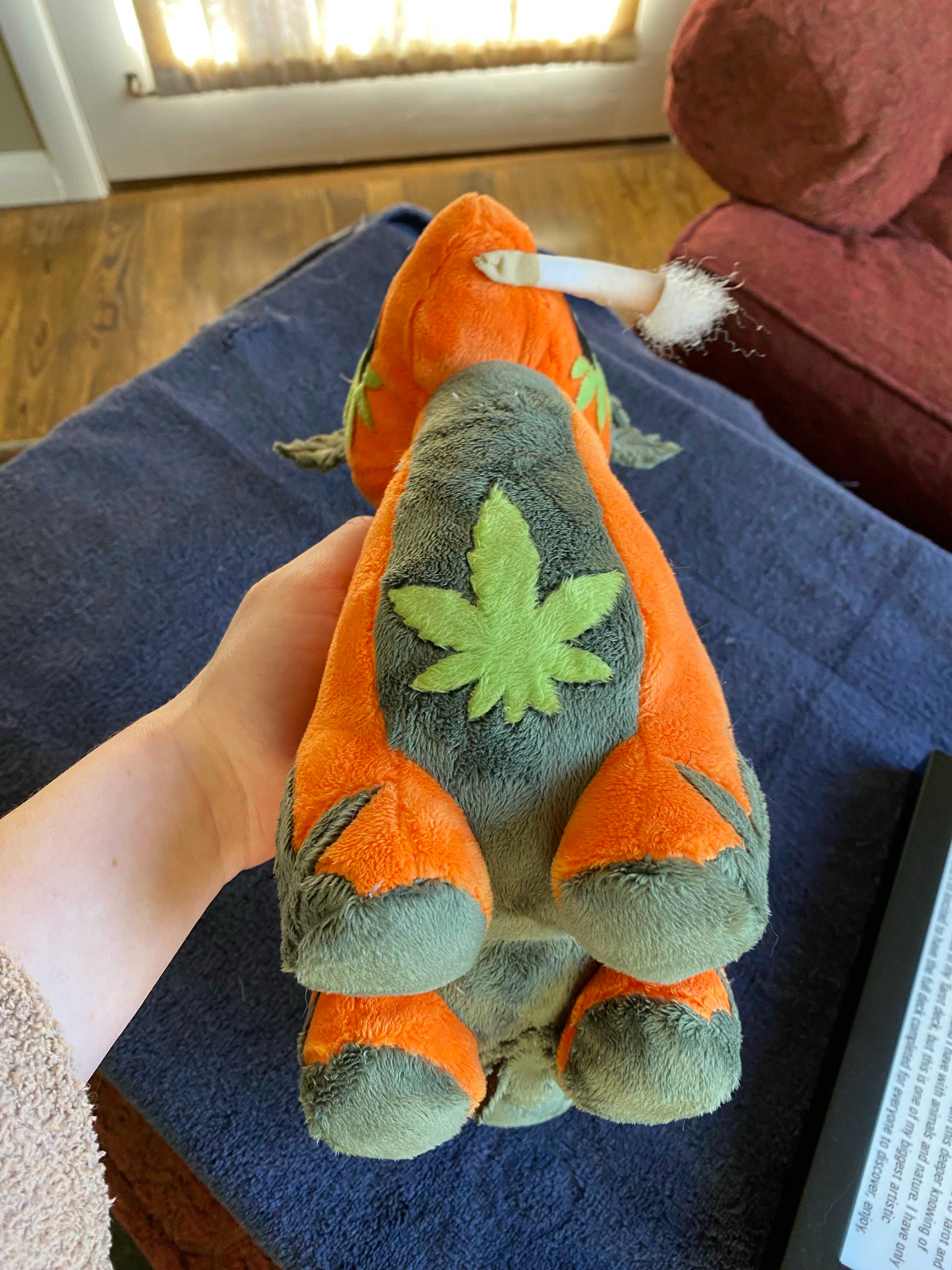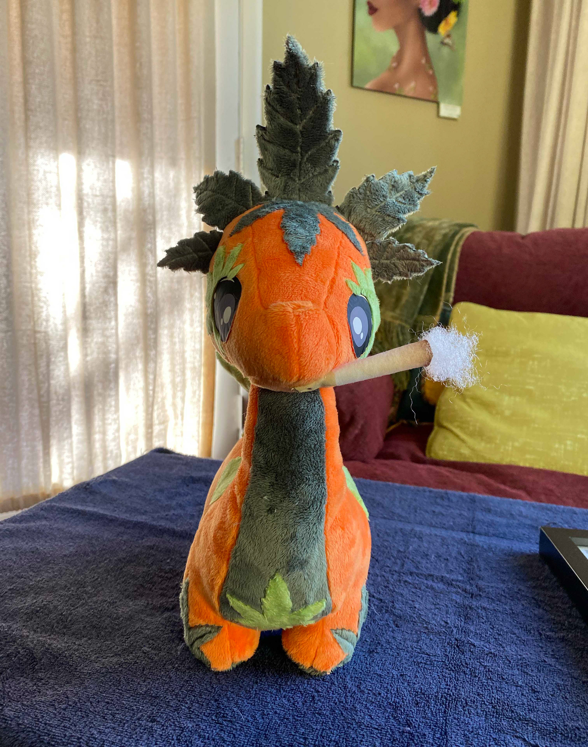 Don't bogart the weed bro! Get high and cuddle with this Weedasaurus! It sports a magnetically attachable joint and loves weed so much it has even evolved spikes and camouflage mimicking its favorite plant!